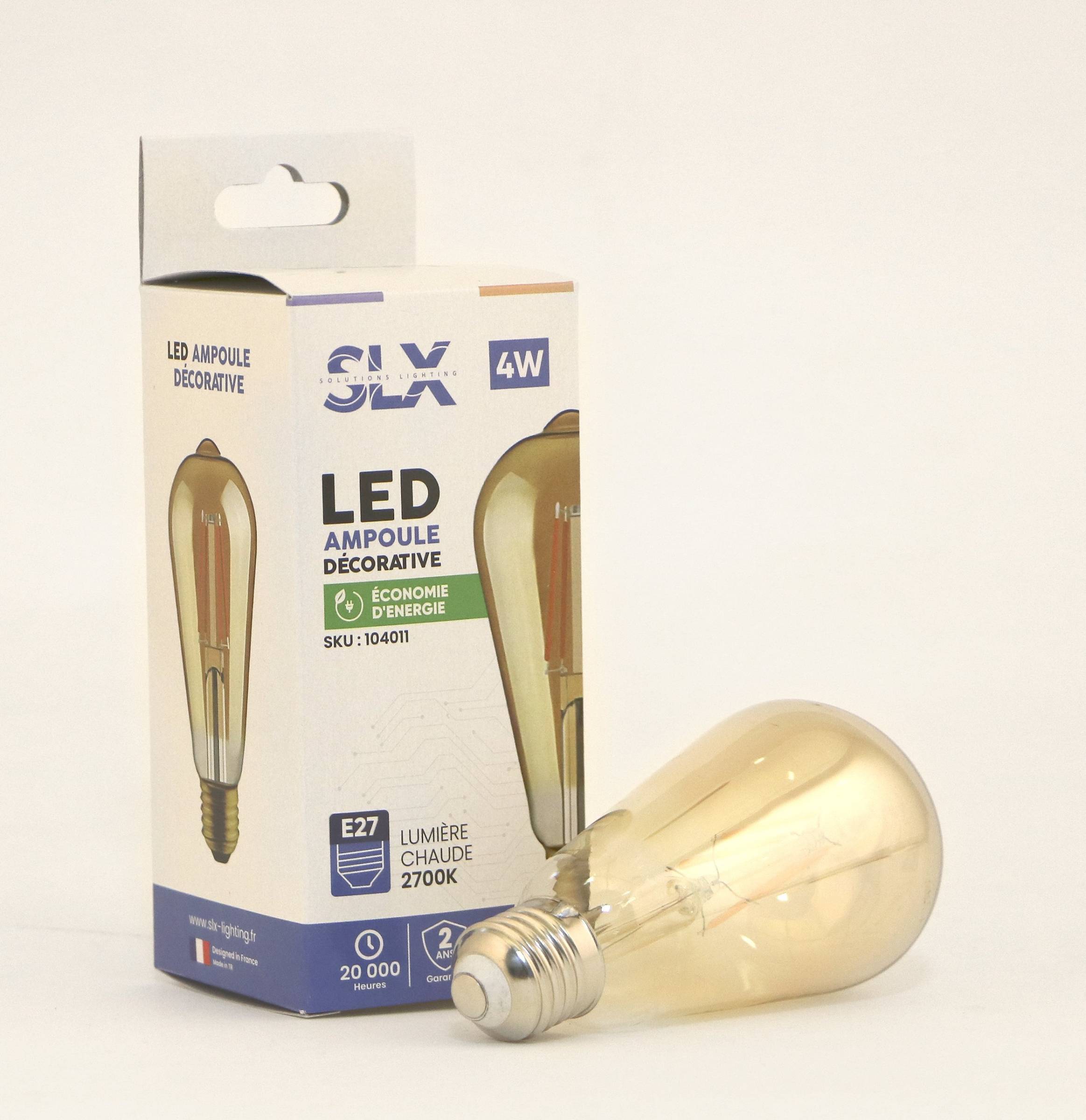 Ampoule SLX en verre ambré 4W ST64 E27 2700K - l’ampoule SLX, une option économique en énergie et parfaitement adaptée pour les grossistes et revendeurs dans diverses régions d'Afrique, comme le Mali, le Bénin, le Congo Brazzaville, le Tchad, le Togo et le Congo RDC.